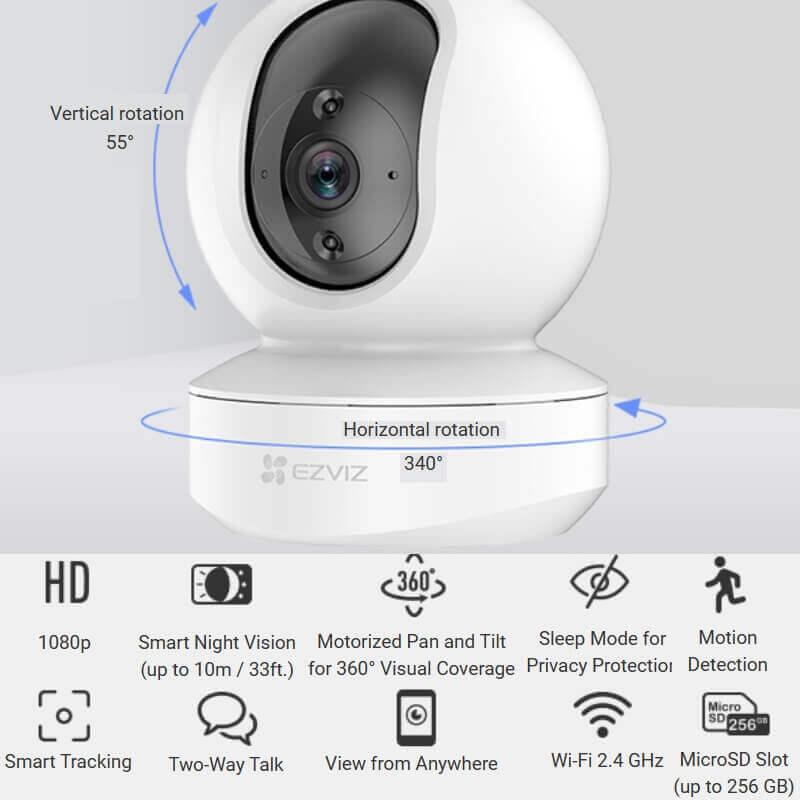 1080P | Motorized Pan and Tilt for 360° Visual Coverage | Motion Detection | Two-Way Talk | Wi-Fi 2.4 GHz | Smart Night Vision (up to 10m / 33ft.) | Sleep Mode for Privacy Protection | Smart Tracking | View from Anywhere | Micro SD Slot (up to 256 GB) | Live View | Instant Alerts | Video History | Up to 8x Zoom | Smart Home Enabled